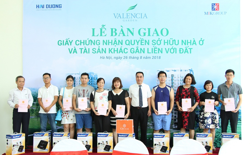 Alomuabannhadat - Sáng ngày 26/08 vừa qua, cư dân tại dự án Valencia Garden (CT19B Khu đô thị mới Việt Hưng, Long Biên, Hà Nội) đã được đơn vị phát triển dự án MIKGroup cùng chủ đầu tư Công ty TNHH đầu tư và tư vấn Hải Dương trao Giấy chứng nhận quyền sở hữu nhà ở.
