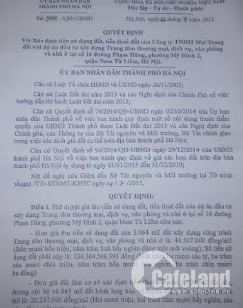 Quyết định số 3411/QĐ-UBND của UBND TP Hà Nội ngày 22/7/2015 xác định tiền sử dụng đất, tiền thuê đất của Công ty TNHH Mai Trang (nay là dự án Sunshine Center) đối với dự án đầu tư xây dựng trung tâm thương mại, dịch vụ, văn phòng và nhà ở tại số 16, đường Phạm Hùng (Mỹ Đình 2, Nam Từ Liêm, TP. Hà Nội).