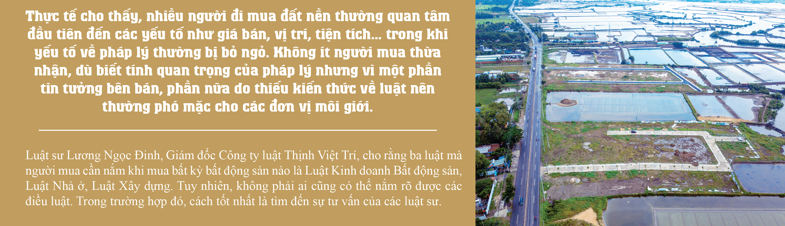 Thực tế cho thấy, nhiều người đi mua đất nền thường quan tâm đầu tiên đến các yếu tố như giá bán, vị trí, tiện tích… trong khi yếu tố về pháp lý thường bị bỏ ngỏ. Không ít người mua thừa nhận, dù biết tính quan trọng của pháp lý nhưng vì một phần tin tưởng bên bán, phần nữa do thiếu kiến thức về luật nên thường phó mặc cho các đơn vị môi giới.