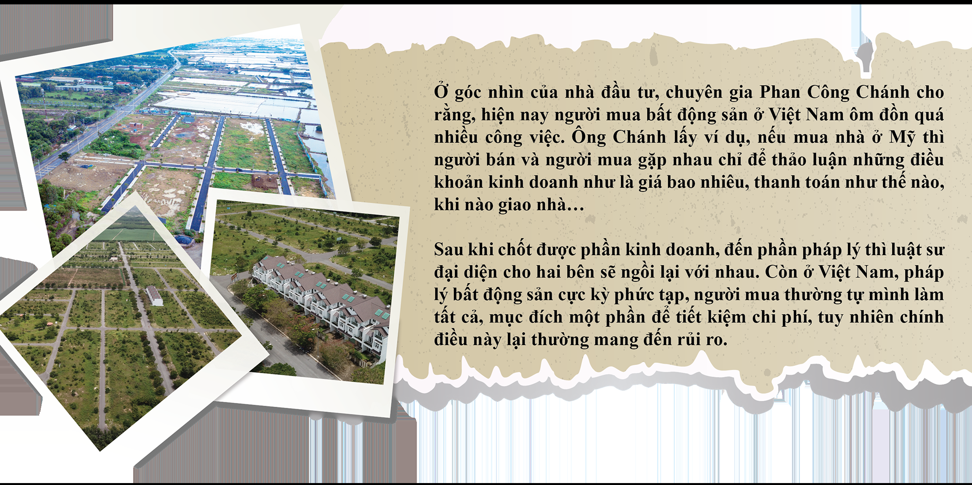 Ở góc nhìn của nhà đầu tư, chuyên gia Phan Công Chánh cho rằng, hiện nay người mua bất động sản ở Việt Nam ôm đồn quá nhiều công việc. Ông Chánh lấy ví dụ, nếu mua nhà ở Mỹ thì người bán và người mua gặp nhau chỉ để thảo luận những điều khoản kinh doanh như là giá bao nhiêu, thanh toán như thế nào, khi nào giao nhà…