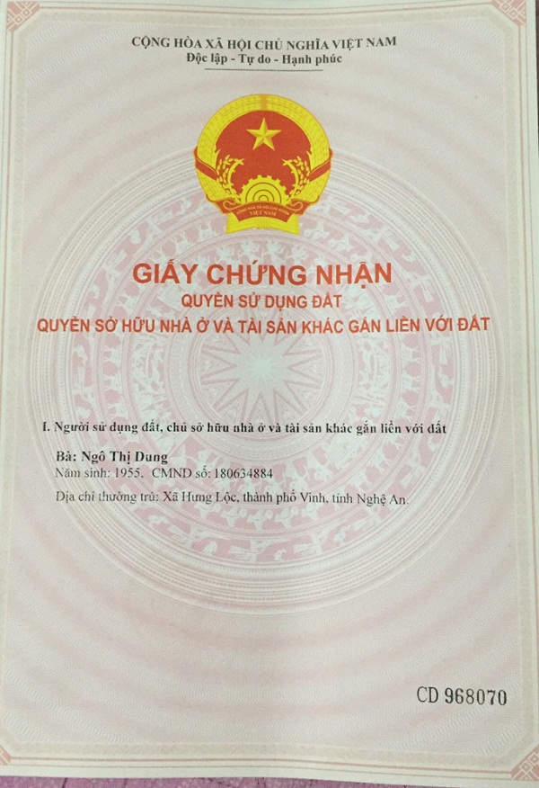 Bà Ngô Thị Dung, sinh năm 1955, là thân nhân liệt sỹ, gửi đơn đến báo Pháp luật Việt Nam trình bày: Bà là chủ sở hữu hợp pháp của mảnh đất có tổng diện tích 782m2 thuộc thửa đất số 71, tờ bản đồ số 23, tại xóm 22, xã Nghi Phong, được UBND huyện Nghi Lộc cấp GCNQSDĐ ngày 29/11/2016. Năm 2017, anh H.T.Q (con trai bà Dung) cần tiền để đi xuất khẩu lao động ở nước ngoài, nên bà Dung đã thế chấp mảnh đất cùng ngôi nhà nêu trên cho Ngân hàng TMCP Công Thương Việt Nam – Chi nhánh TP Vinh.