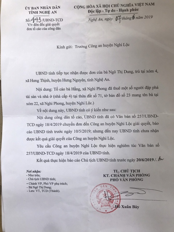 Cụ thể, ngày 07/06/2019 UBND tỉnh ban hành văn bán số 443, gửi Trưởng công an huyện Nghi Lộc, nội dung văn bản ghi rõ: “Nội dung công dân tố cáo, UBND tỉnh đã có Văn bản số 257/UBND-TCD ngày 18/04/2019 chuyển đơn đến Công an huyện Nghi Lộc, báo cáo UBND tỉnh trước ngày 10/05/2019; nhưng đến nay tỉnh chua nhận được kết quả giải quyết của công an huyện Nghi Lộc".