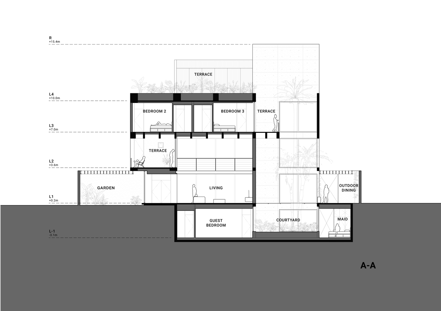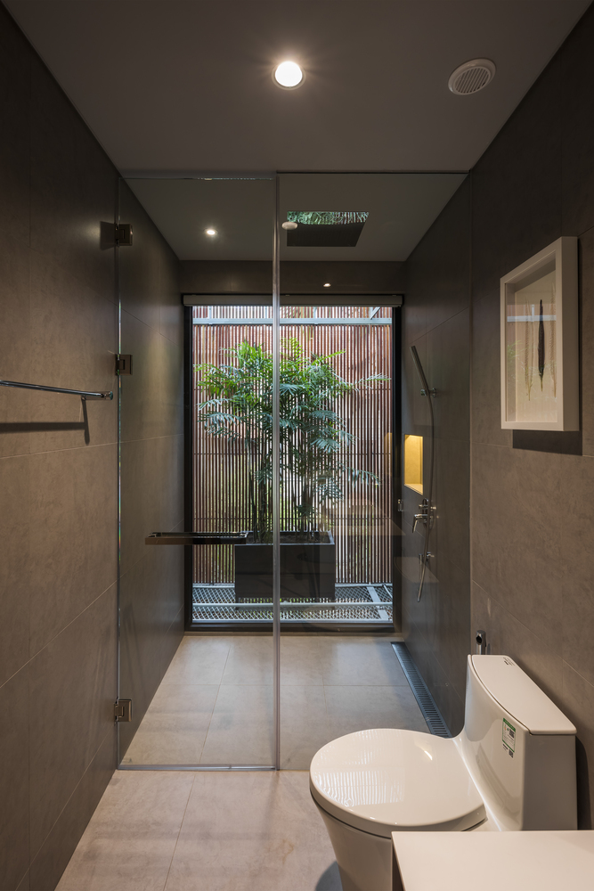 Tương tự với tầng thứ hai và tầng thứ ba khối bê tông được dùng để phân định ranh giới giữa không gian thư giãn và không gian riêng tư.