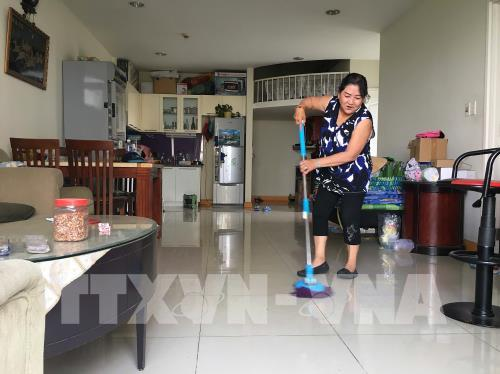 Bà Huỳnh Thị Đào (ở tầng 4, block C, chung cư Carina Plaza) trở về nhà quét dọn, lau chùi căn hộ của mình. Ảnh: Thanh Vũ - TTXVN