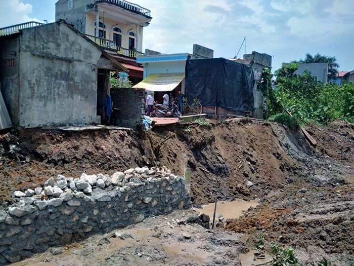 Theo quan sát của phóng viên, quá trình thi công ao 6 sào, nhiều hộ dân gần điểm nạo vét bị sạt lún, đặc biệt là hộ gia đình ông Lưu Văn Giang. Một phần góc sân, khoảng gần chục mét bị sụt sâu cả mét và toàn bộ bức tường rào bao quanh cũng bị sập đổ hoàn toàn.