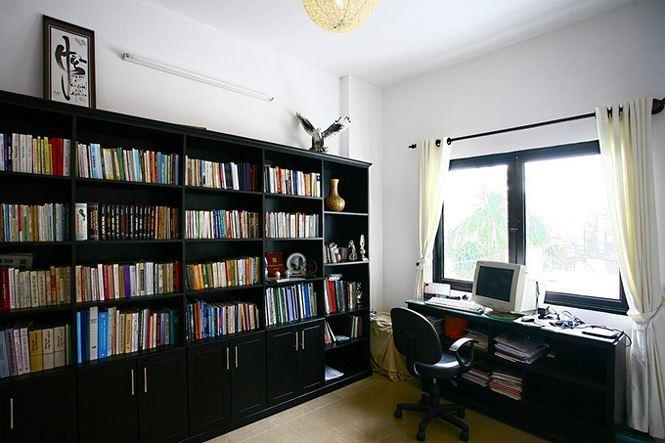 Góc làm việc nhỏ trong thư phòng hướng ra khoảng sân trước.