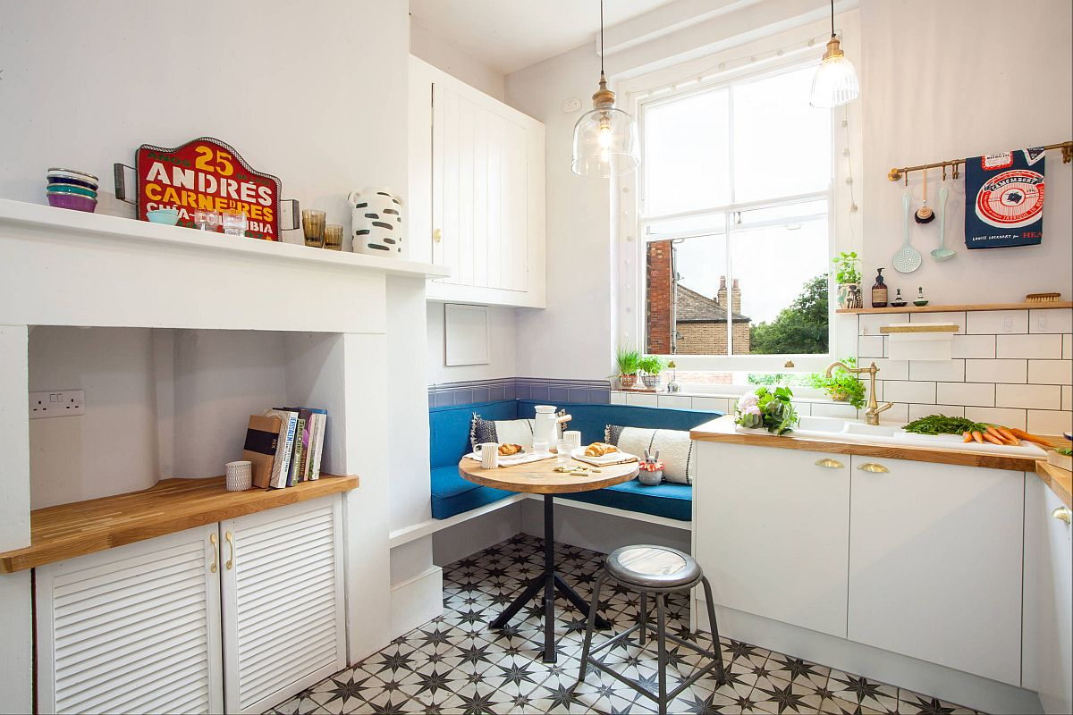 Ghế bành màu xanh bên trong nhà bếp chiết trung nhỏ thêm màu sắc trong khi tận dụng không gian góc.