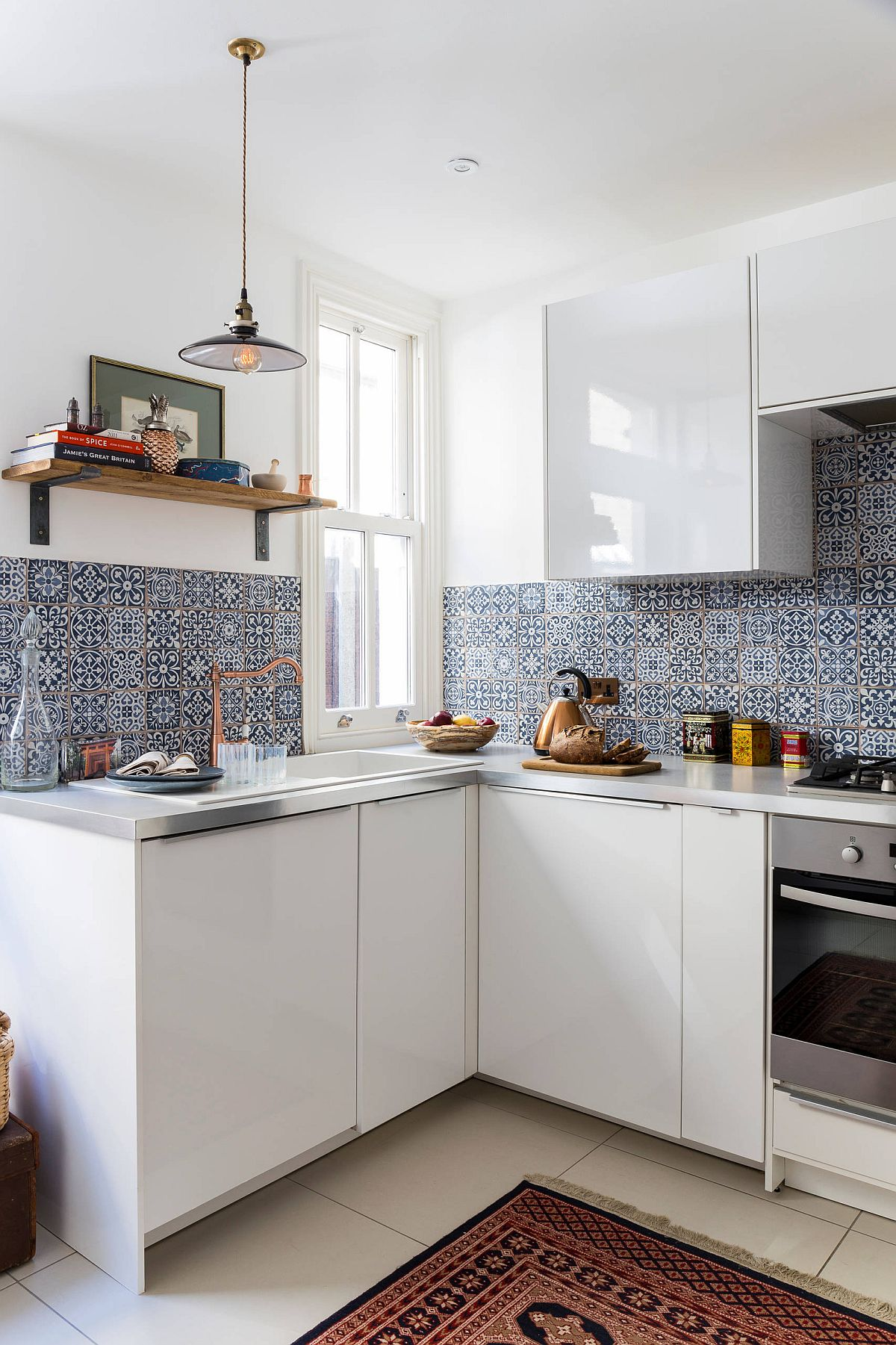 Gạch mang hoa văn cho phông nền mà không làm thay đổi bảng màu của nội thất nhà bếp nhỏ chiết trung.