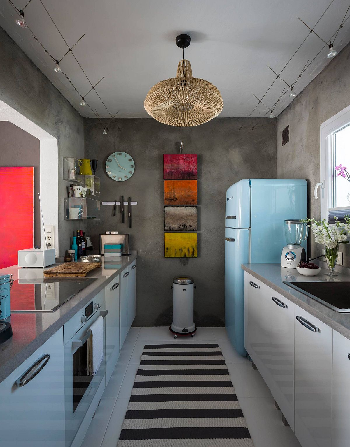 Sử dụng tủ lạnh cổ điển để thêm màu sắc cho nội thất nhà bếp nhỏ chiết trung với những bức tường bê tông.