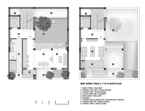 Tầng 4 là không gian yêu thích nhất vì có khi vườn nhiệt đới chuyển tiếp, kết nối giữa phòng học, phòng thờ, cũng là nơi gia chủ uống trà, thiền vào sáng sớm hoặc tối hay tiếp những vị khách đặc biệt.