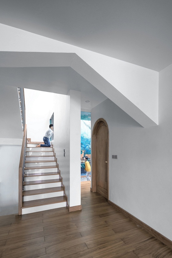 Tầng 1 là không gian tiếp khách, tầng lửng gồm bếp và phòng ăn, tầng 3 là tầng dành cho trẻ với gam màu xanh, có diện tích rộng rãi, thoải mái an toàn để trẻ chơi, học và ngủ. Cuối cùng là tầng 4 là tầng có nhiều chức năng như phòng thờ, phòng học và phòng ngủ dành cho trường hợp khách ở lại.
