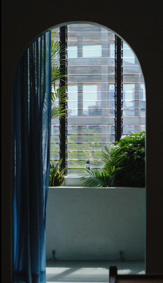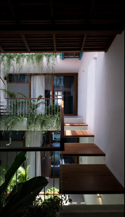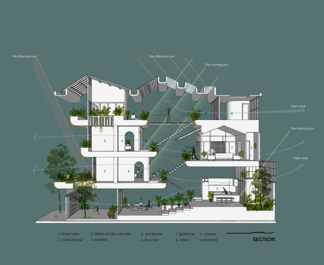 Không gian bậc thang cùng hệ mái tầng bậc cao tạo ra những khu vườn tầng tiếp diễn những khoảng lùi sâu che chắn ánh sáng vào buổi chiều. Từ mỗi phòng ngủ, con người đón nhận ánh nắng ban mai xuyên qua tán lá xanh bên những ô cửa lớn.