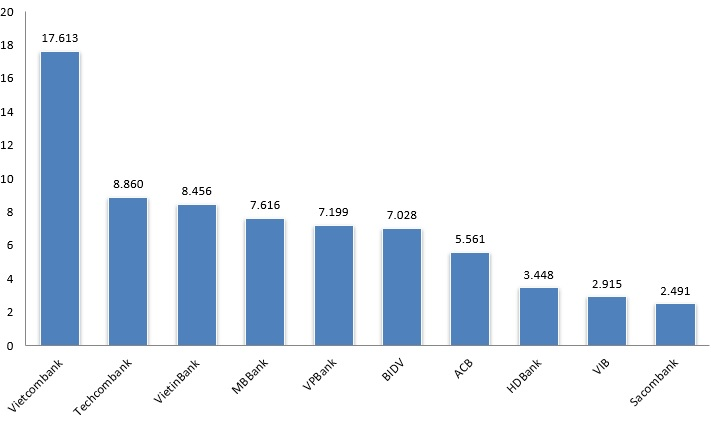 10 ngân hàng TMCP có lợi nhuận trước thuế cao nhất. Đơn vị: tỉ đồng