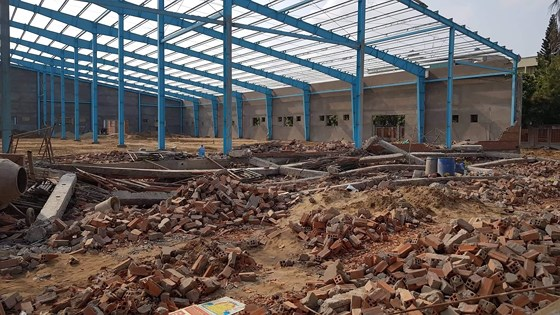 Theo đó, chiều cao, diện tích lớn và đứng độc lập với hệ khung thép của công trình và không đảm bảo khả năng chịu lực. Bức tường sập có độ mảnh theo phương ngoài mặt phẳng vượt quá giới hạn cho phép, bị mất ổn định dưới tác dụng của các tải trọng tác động trong quá trình thi công.