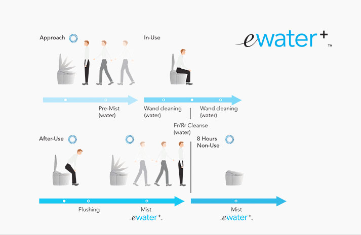 Sau 8 tiếng không sử dụng, Ewater+ sẽ được tự động phun một lần để khử trùng bồn cầu. Dòng nước của công nghệ Ewater+ sẽ trở lại bình thường sau sử dụng mà không gây phản ứng phụ hay tổn hại nào cho người sử dụng.