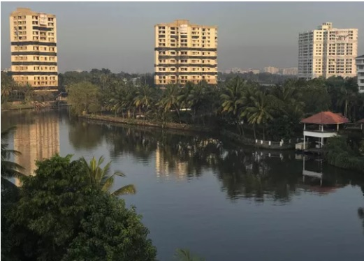 Các căn chung cư xây dựng bất hợp pháp gần bờ hồ Vembanadu xinh đẹp ở quận Maradu, bang Kerala.