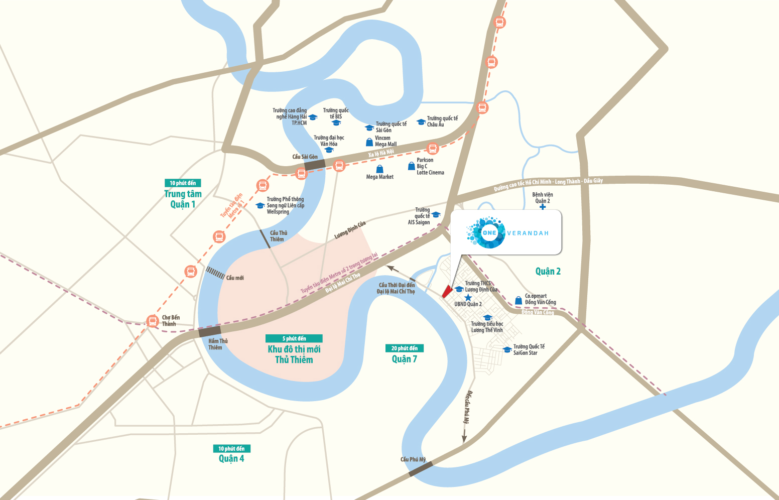 Tọa lạc trên khu đất rộng 1,7ha ngay tại trung tâm khu dân cư Thạnh Mỹ Lợi, giáp 4 mặt tiền đường Tạ Hiện, Bát Nàn, Nguyễn Văn Kỉnh và đường số 103 – TML, vị trí địa lý đắc địa giúp mang đến tầm nhìn sông Sài Gòn tuyệt đẹp và toàn cảnh TP.HCM là yếu tố giúp One Verandah nổi bật so với các dự án khác cùng khu vực.