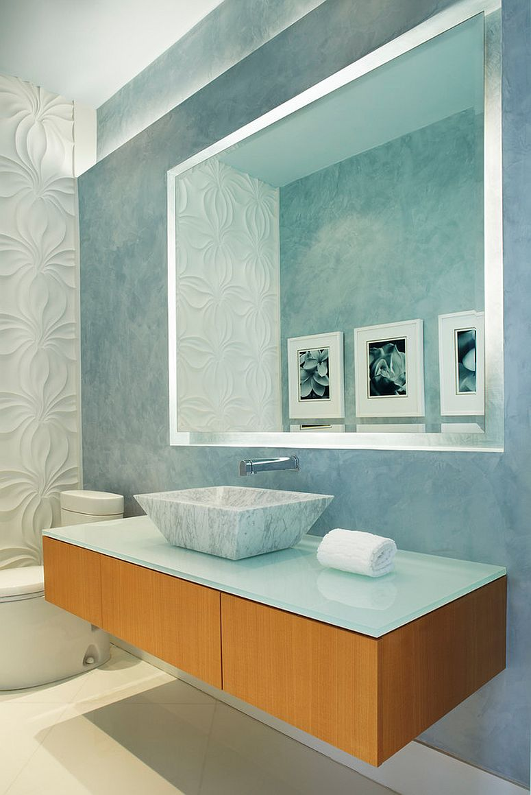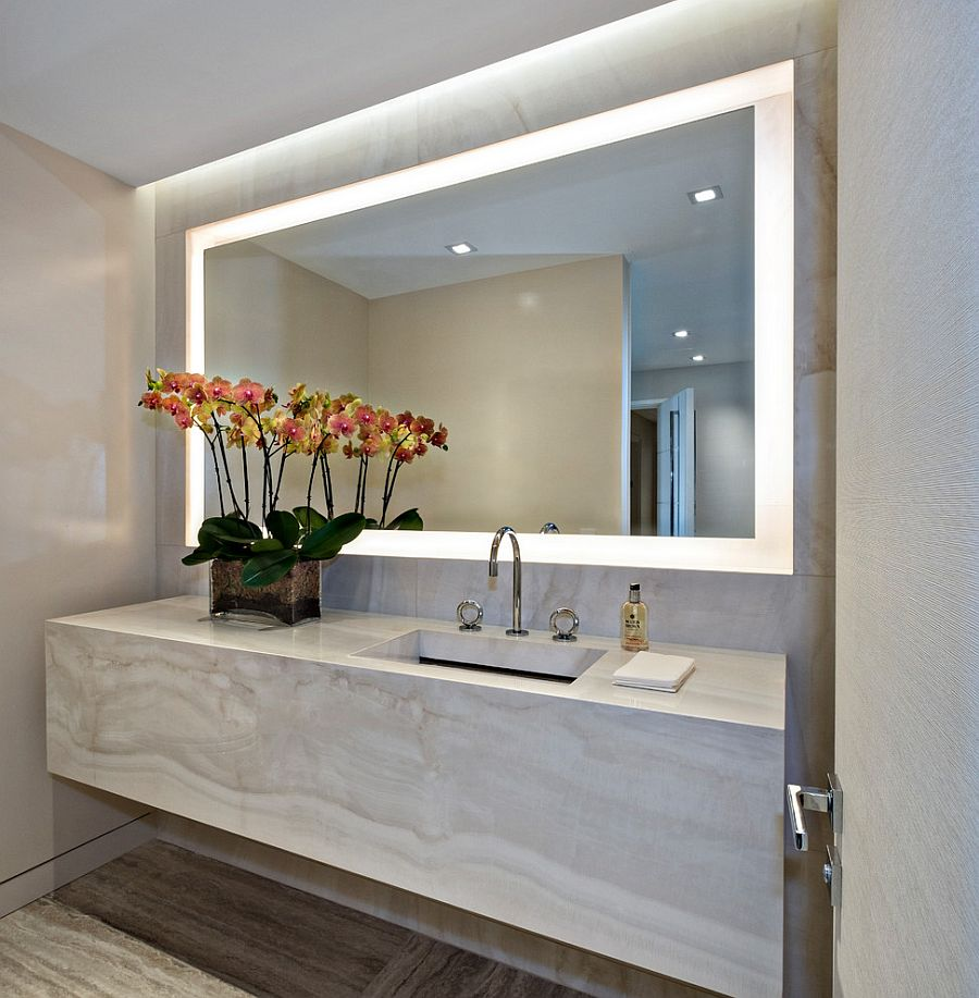 Sự kết hợp ánh sáng, gương soi và bồn rửa bằng đá tạo cho không gian phòng tắm hiện đại sang trọng và cảm giác thông thoáng.