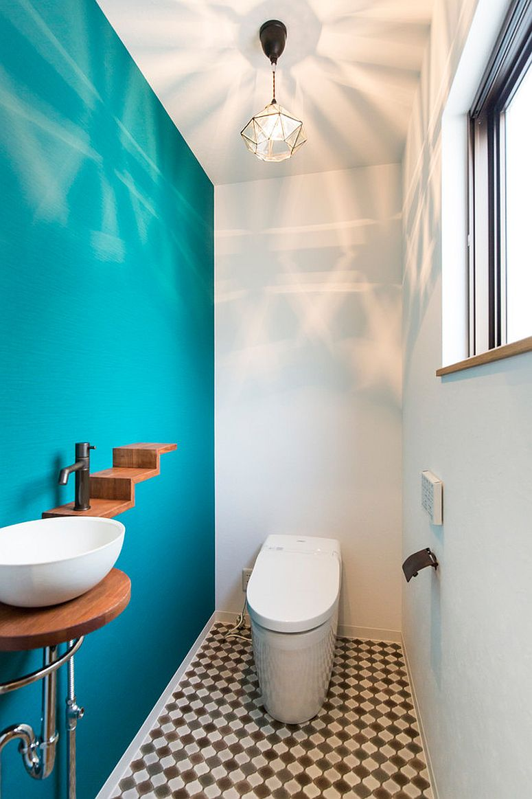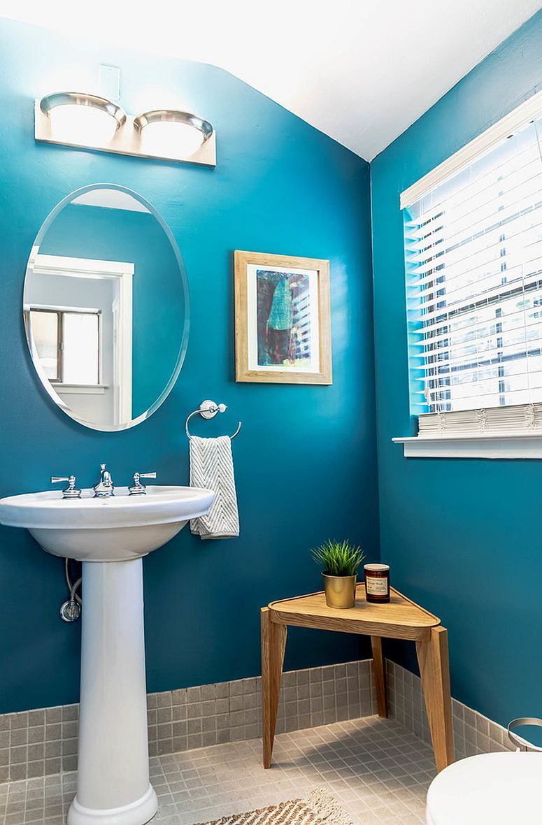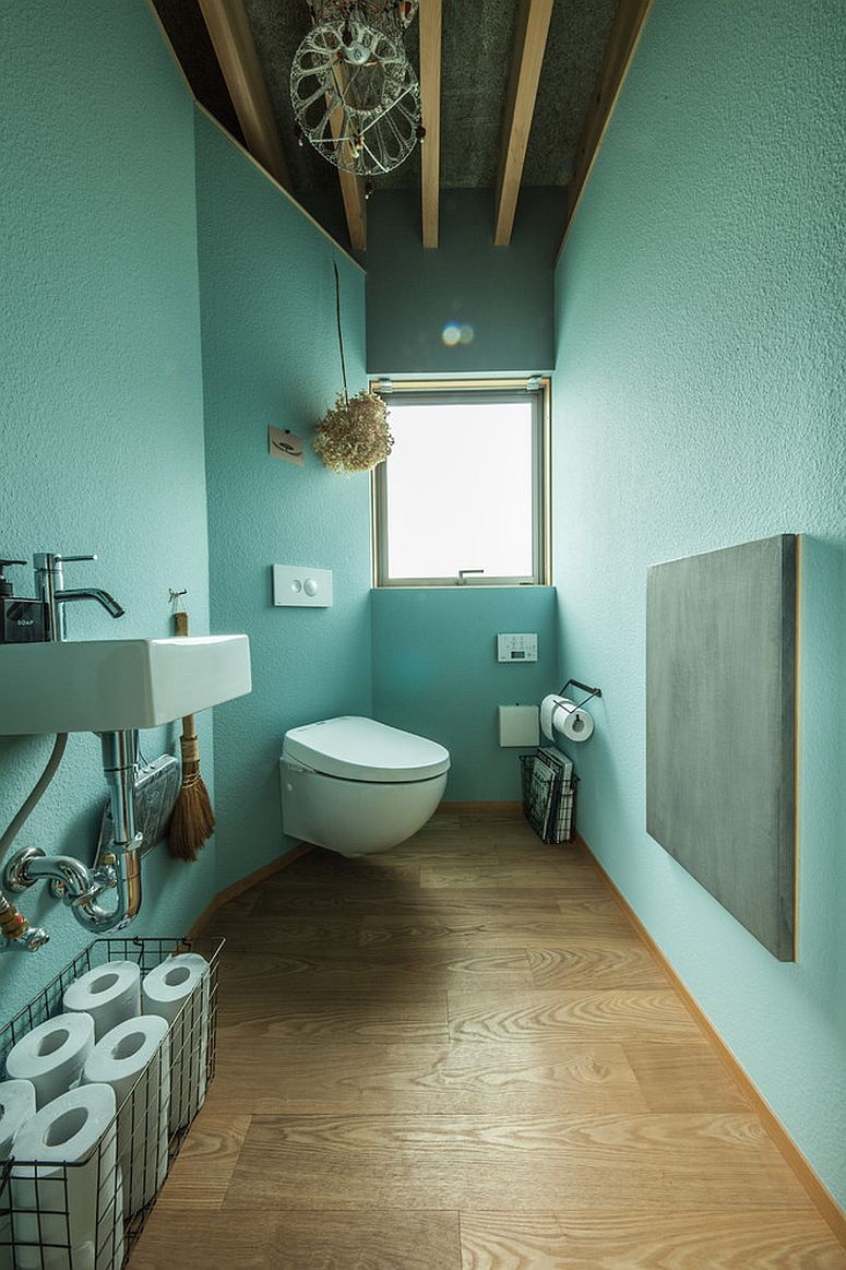 Phòng tắm với màu lam ngọc đơn sắc cùng sàn gỗ ấm áp.
