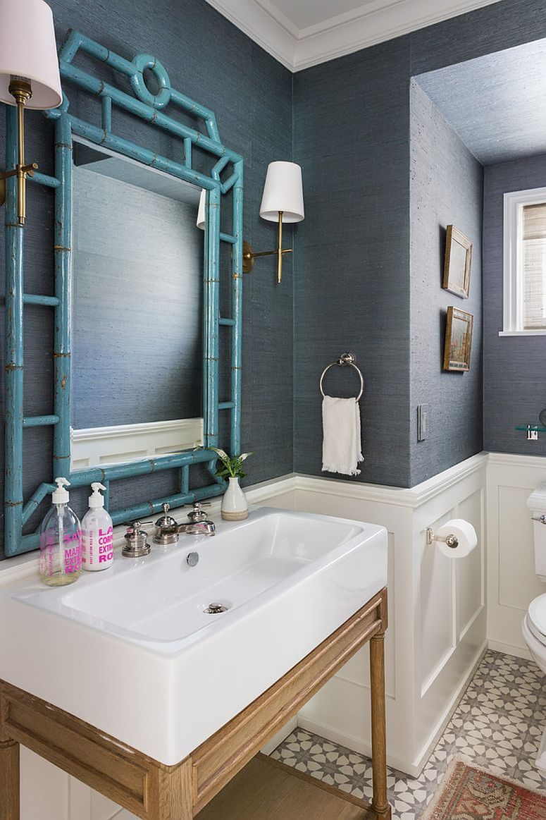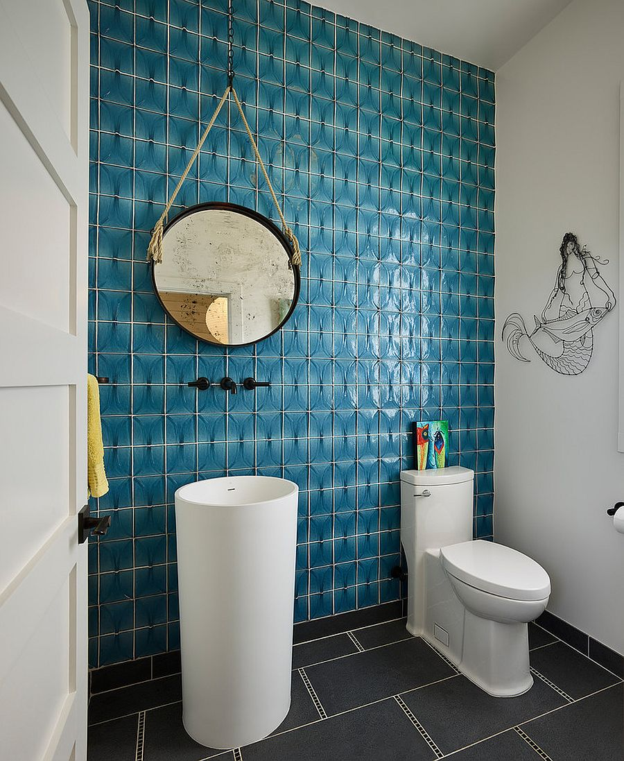 Với màu lam ngọc, ngay lập tức gợi lên hình ảnh của mùa hè và hương vị phong cách bãi biển. Bạn có thể sử dụng nhiều sắc thái khác nhau của màu sắc này để trang trí cho phòng tắm.