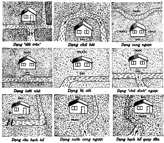 - Đất cạnh ao hồ nhưng ở vị trí vòng ngoài của khúc cua sông (dòng chảy uốn cong ra ngoài nhà) sẽ không tụ khí. Hoặc nhà có đường phản cung, cung đường cong ra ngoài không ôm lấy nhà dễ trở thành thế bị cung tên (đường cong) chĩa vào;