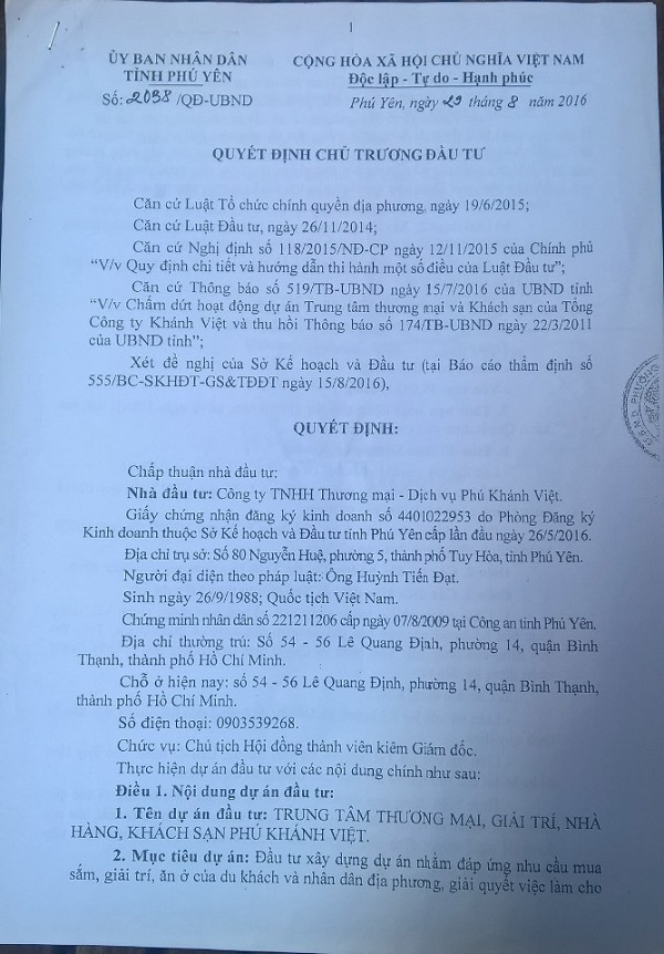 Liên qua tới thông báo tạm dừng triển khi dự án, trao đổi với PV DĐDN, đại diện Công ty TNHH Thương mại – Dịch vụ Phú Khánh Việt, cho biết: Công ty Phú Khánh Việt là doanh nghiệp đã được Ủy ban nhân dân tỉnh Phú Yên cho phép thực hiện dự án Trung tâm thương mại, giải trí, nhà hàng, khách sạn Phú Khánh Việt Yên, tại địa chỉ số 80 Nguyễn Huệ, phường 5, TP Tuy Hoà, tỉnh Phú Yên. Và theo Quyết định số 2038/QĐ- UBND ngày 29/08/2016, UBND tỉnh Phú Yên đã chấp thuận chủ trương cho doanh nghiệp được đầu tư, triển khai xây dựng.
