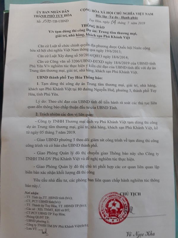 UBND tỉnh Phú Yên, bất ngờ ra thông báo yêu cầu doanh nghiệp phải tạm dừng mọi hoạt động liên quan tới việc triển khai dự án Trung tâm thương mại, giải trí, nhà hàng, khách sạn Phú Khánh Việt, tại địa chỉ số 80 Nguyễn Huệ, phường 5, TP Tuy Hoà, tỉnh Phú Yên.