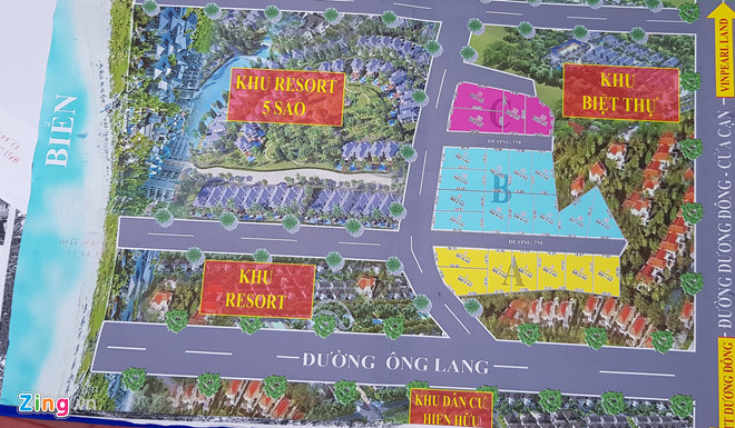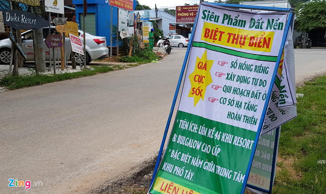 Cách hàng rào chắn lối xuống biển khoảng 1 km, một nhóm thanh niên kê bàn ghế dưới tán cây ở ngã ba đường đề rao bán "siêu phẩm đất nền biệt thự biển" với giá 18 triệu đồng/m2. Nhóm tiếp thị bất động sản này nói với khách đây là "giá cực sốc" tại khu đất có sổ hồng riêng, xây dựng tự do, quy hoạch đất ở, cơ sở hạ tầng hoàn thiện.