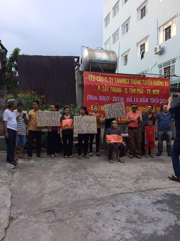 Nhiều hộ dân sinh sống tại tổ 72, khu phố 4, phường Tây Thạnh, quận Tân Phú, TP.HCM liên tục căng băng rôn yêu cầu Công ty Cổ phần Sản xuất Kinh doanh Xuất nhập khẩu Dịch vụ và Đầu tư Tân Bình (Công ty Tanimex) và chính quyền Quận Tân Phú trả lại tuyến đường B1 như đã cam kết.