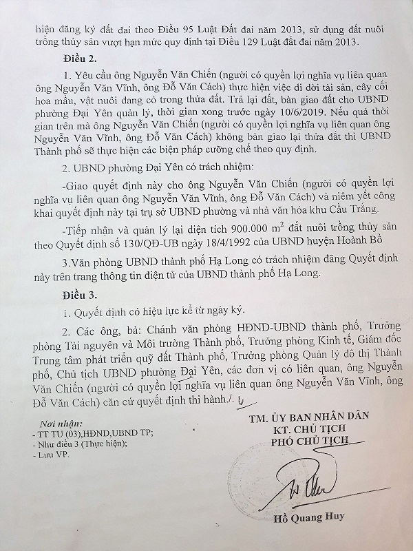 Quyết định 3099 của UBND TP Hạ Long về việc thu hồi và hủy bỏ quyết định130 QĐ-UB của UBND huyện Hoành Bồ ngày 18 tháng 4 năm 1992 giao đất cho ông Chiến làm đầm, thu hồi toàn bộ đầm nuôi của gia đình ông và không đền bù với lí do hết thời hạn giao đất và khu đất này hiện không nằm trong quy hoạch đất lâm nghiệp, nuôi trồng thủy, hải sản