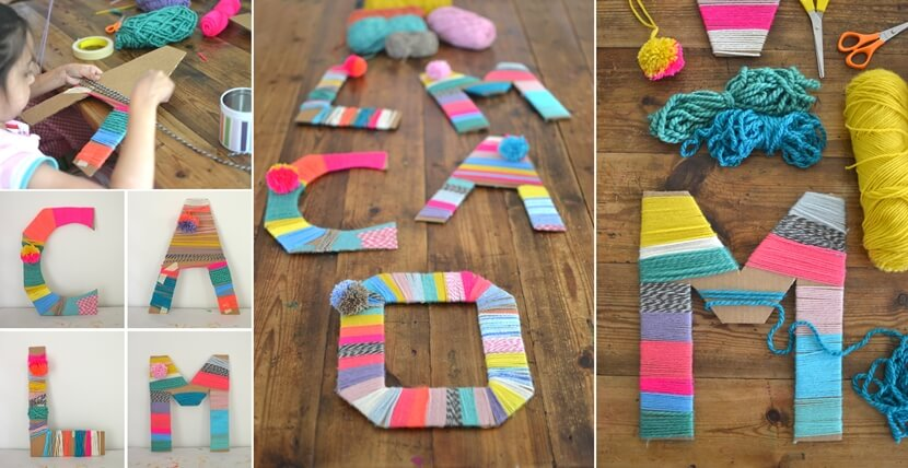 Cắt bìa carton thành các chữ cái, sau đó bọc chũng bằng những sợi dây màu sắc để trang trí tường nhà thêm ấn tượng.
