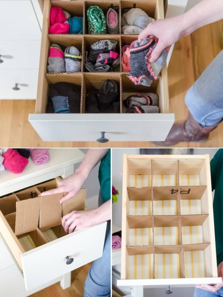 Thực hiện các phép đo và cắt bìa carton dùng để chia ô nhỏ, giúp ngăn kéo đựng đồ luôn gọn gàng, ngăn nắp.