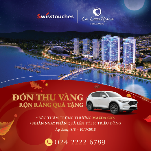 Từ ngày 08/08 đến 10/09/2018, Công ty CP Khách sạn Bến Du Thuyền (Marina Hotel .JSC) - chủ đầu tư dự án Swisstouches La Luna Resort Nha Trang triển khai chương trình tri ân khách “Đón thu vàng – Trúng ngay Mazda CX5” và nhận các giải thưởng khác lên tới 50 triệu đồng với tổng giá trị giải thưởng là 2,5 tỷ đồng. .