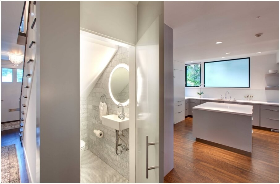 Góc cầu thang có thể cải tạo thành không gian phòng tắm để tiết kiệm diện tích cho căn nhà.