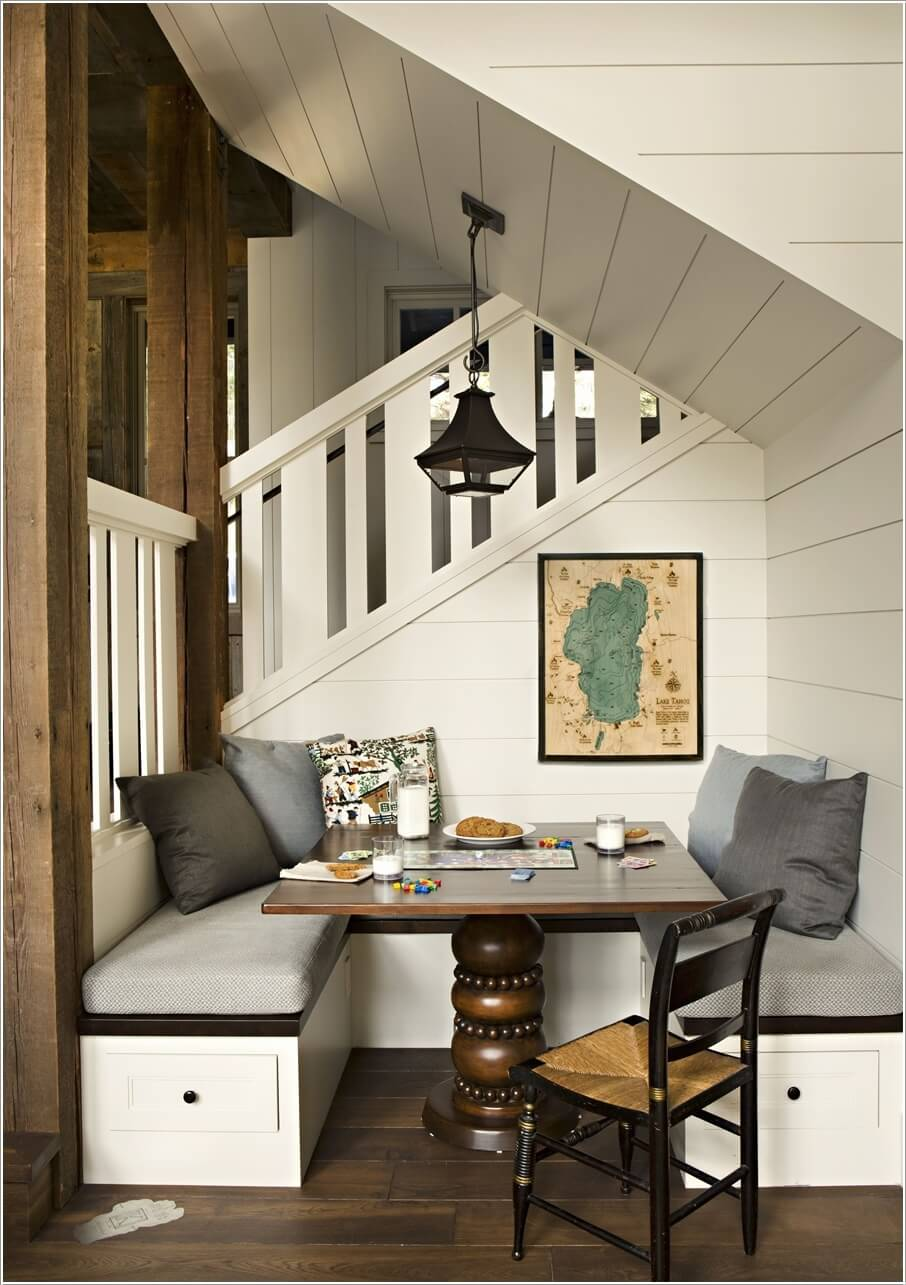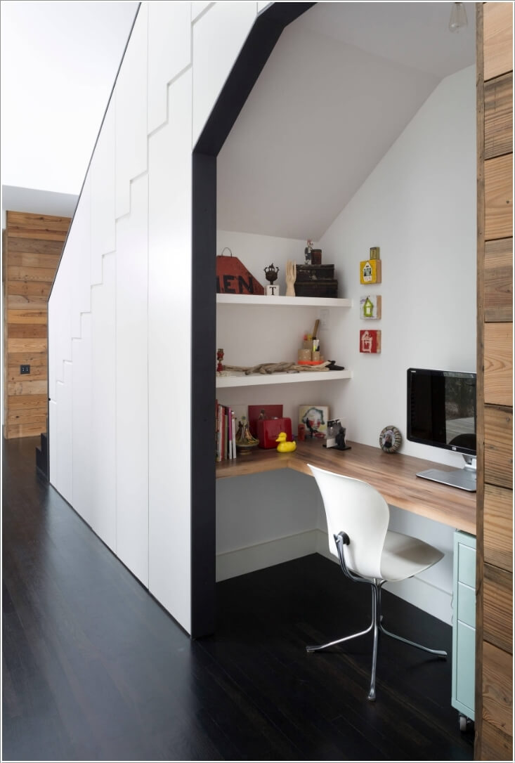 Bố trí một cái bàn nhỏ, một vài kệ lưu trữ tại góc cầu thang tạo thành nơi làm việc tại nhà.