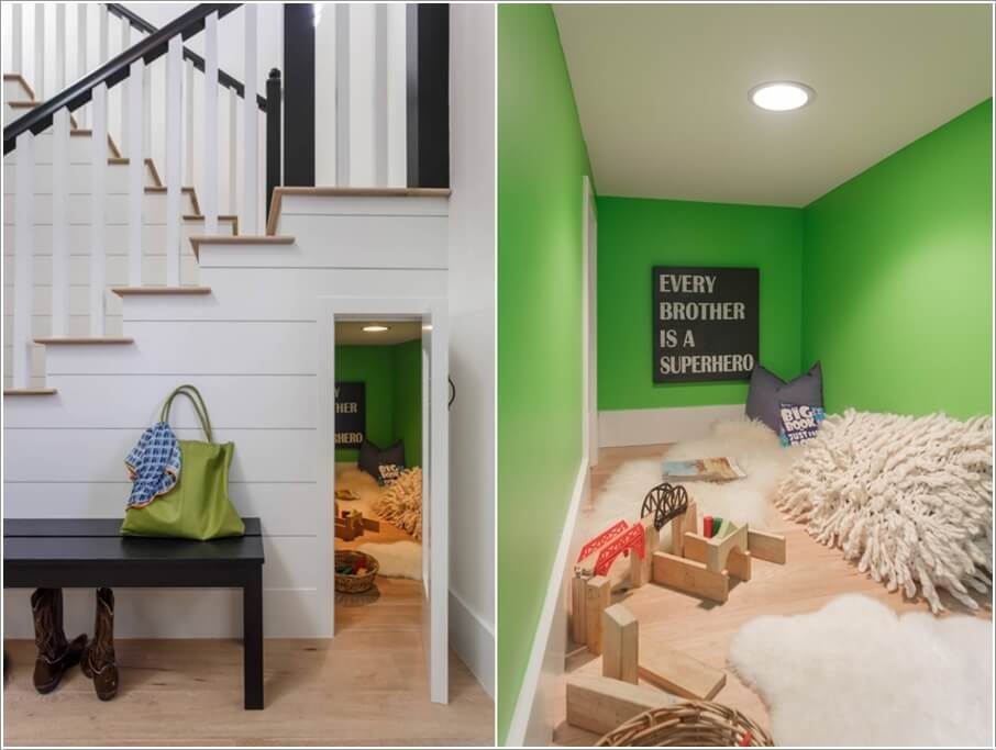 Hay bạn có thể tạo bất ngờ với thiết kế khu vui chơi cho bé ngay góc cầu thang.