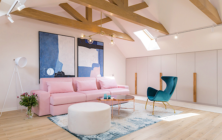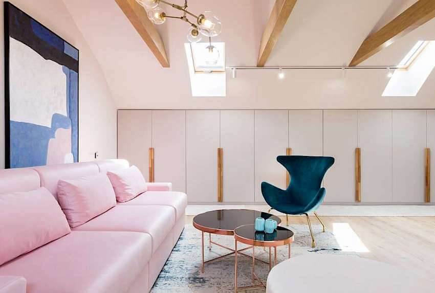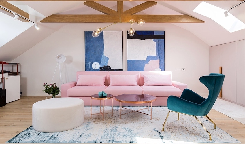Ấn tượng và thu hút ngay khi bước lên căn gác này là ghế sofa ở trung tâm tương phản với bức tranh màu xanh phía sau.
