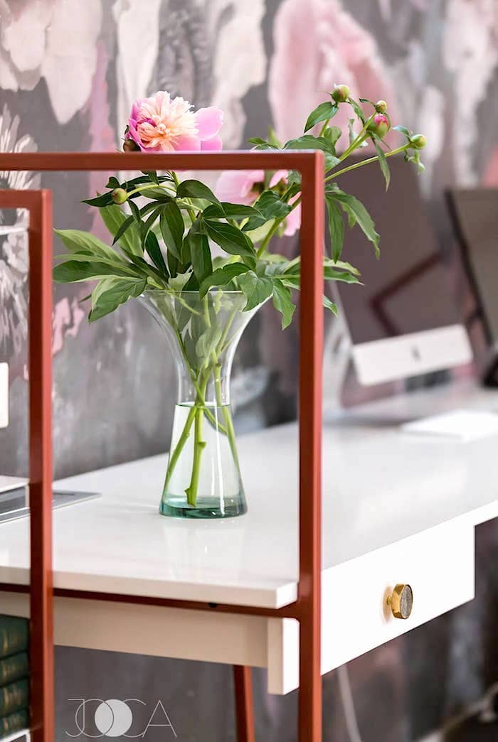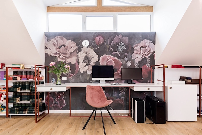 Hoa văn trên tường làm nổi bật khu vực văn phòng và thêm không khí nghệ thuật lên trần nhà. Các giàn gỗ kiểu dáng duy trì một bầu không khí tươi mới cho không gian hiện đại.