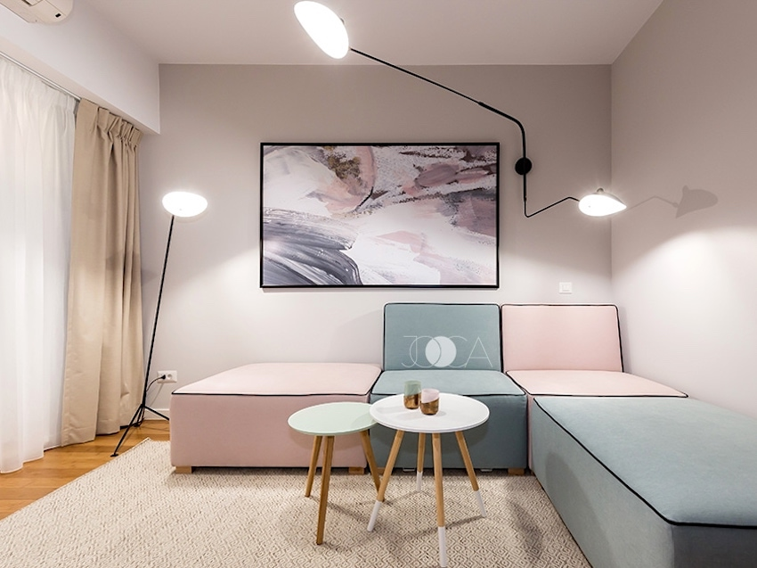 Thêm một chiếc ghế đơn màu xanh lá cây, bàn cà phê chân bàn bằng vàng hồng và một chiếc ghế đẩu màu trắng, đầy màu sắc nữ tính.