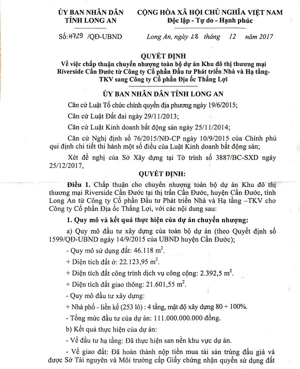 Quyết định chuyển nhượng dự án của UBND tỉnh Long An