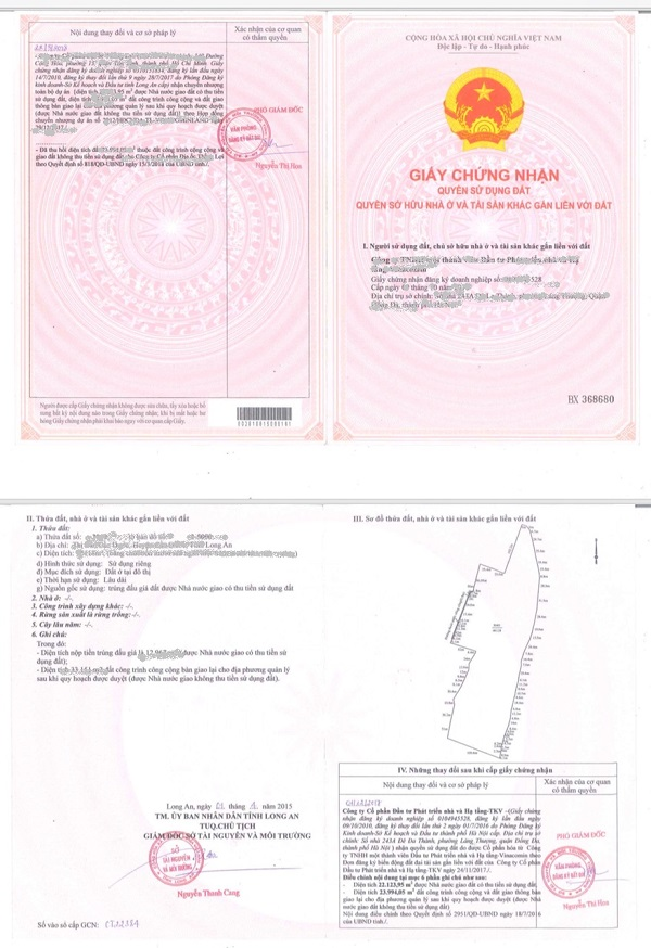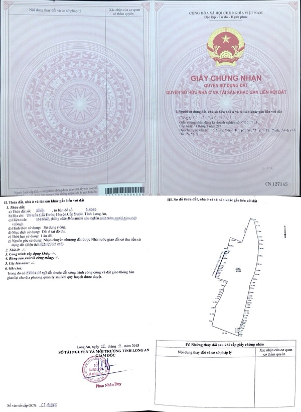 Giấy chứng nhận quyền sử dụng đất của dự án Thắng Lợi Riverside Market được Sở Tài nguyên và Môi trường tỉnh Long An cấp ngày 10/04/2018.