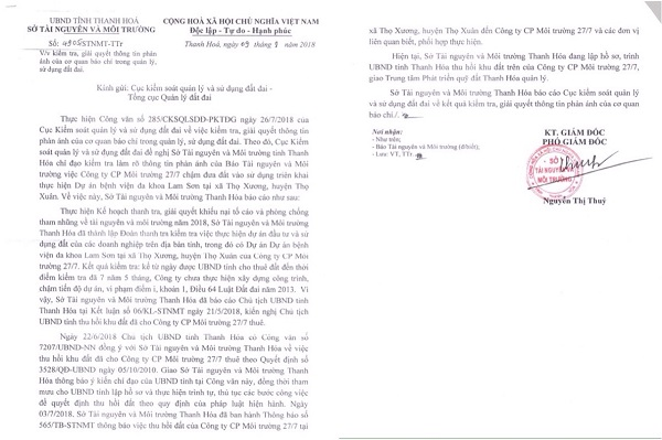 Hiện Sở TN-MT Thanh Hóa đang lập hồ sơ, trình UBND tỉnh Thanh Hóa thu hồi khu đất trên của Công ty cổ phần 27/7, giao Trung tâm phát triển Quỹ đất Thanh Hóa quản lý.