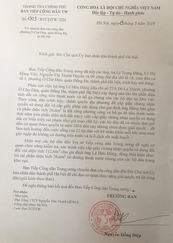 Văn bản do Trưởng ban Nguyễn Hồng Điệp ký trong đó cho biết: Ban tiếp công dân Trung ương đã tiếp các ông, bà Lê Trọng Đặng, Lê Thị Hồng Vân, Nguyễn Thị Thanh Huyền và 9 công dân tại địa chỉ tổ 18 (cụm dân cư số 5, phường Ô Chợ Dừa, quận Đống Đa).