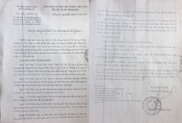 Cụ thể, theo văn bản 146/UBND-TTr của UBND quận Đống Đa do ông Nguyễn Hoàng Giáp - Phó Chủ tịch quận ký làm rõ về việc cấp giấy chứng nhận quyền sử dụng đất (sổ đỏ) cho gia đình ông Lê Hữu Hùng, tại số 27A đường La Thành, phường Ô Chợ Dừa nêu, ngày 14/5/1962, Ủy ban Hành chính thành phố cấp giấy xin tạm sử dụng đất vắng chủ cho ông Lê Hữu Tiến (bố ông Hùng - PV) được tạm sử dụng một phần thửa đất vắng chủ số 45 tờ 30 khu Đống Đa, diện tích 86m2.
