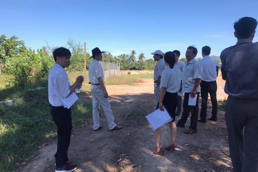 Đoàn kiểm tra của cơ quan chức năng đang kiểm tra việc thi công đường 74, tại dự án Trung tâm thương mại - Khu nhà ở liên kế Phước Lợi. Ảnh: C.H