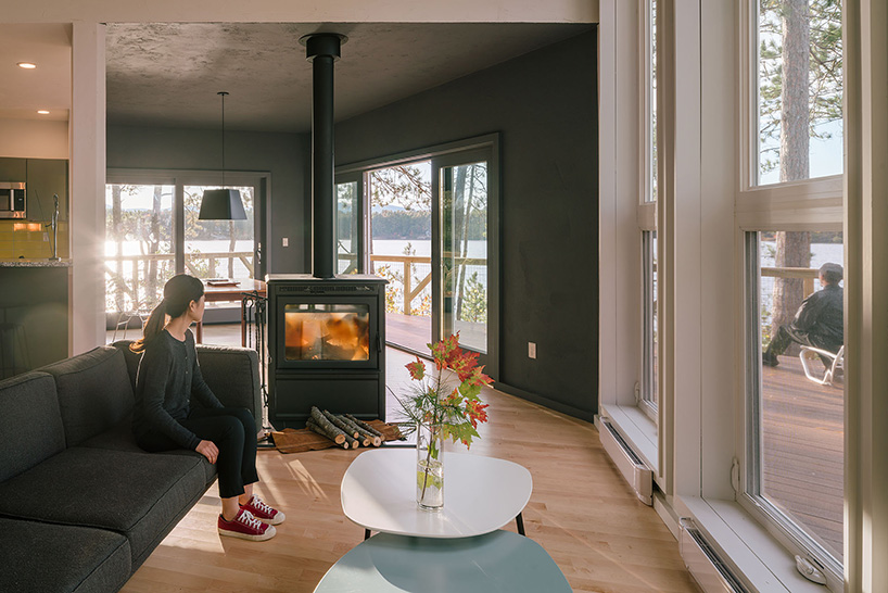 Trong khi đó phòng khách là một không gian mở liên thông với bếp và phòng ăn, cửa sổ tại khắp nơi và lò sưởi thì bố trí ngay trung tâm của căn phòng.