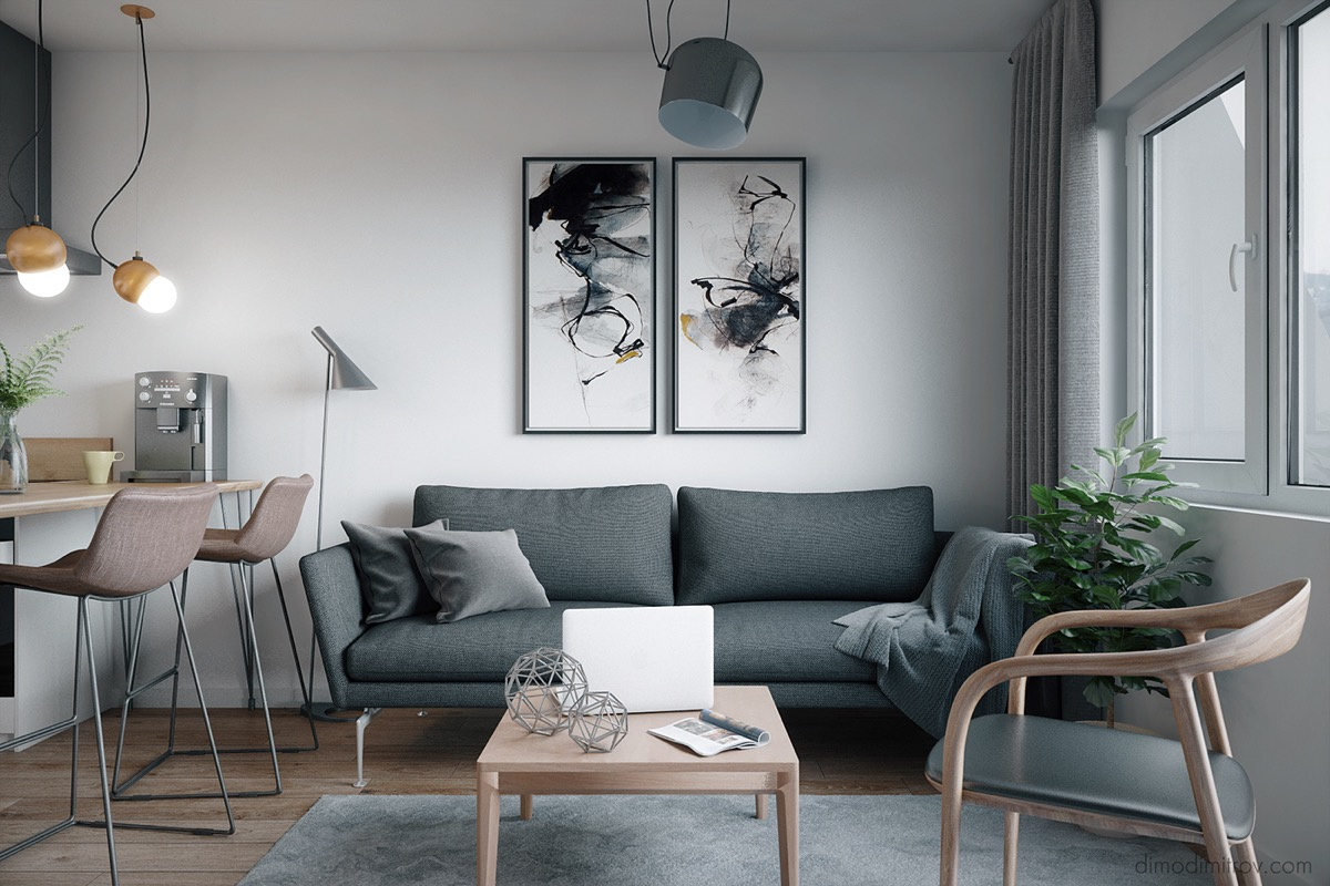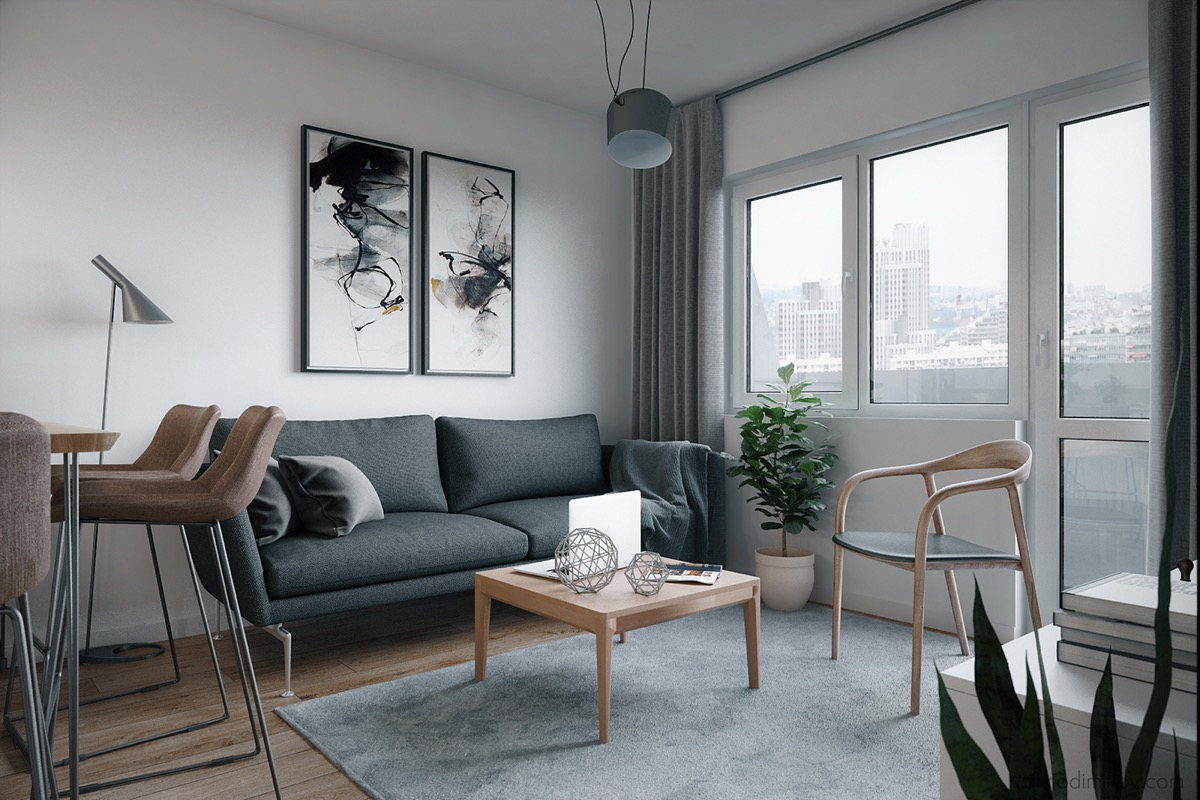 Không gian phòng khách màu xám trung tính được trang trí với điểm nhấn tranh nghệ thuật, ghế sofa nhỏ, thảm sàn màu xám bộ bàn cafe cùng thêm một cây xanh.
