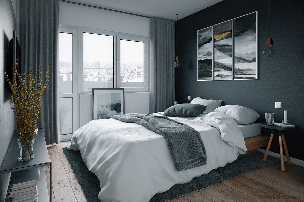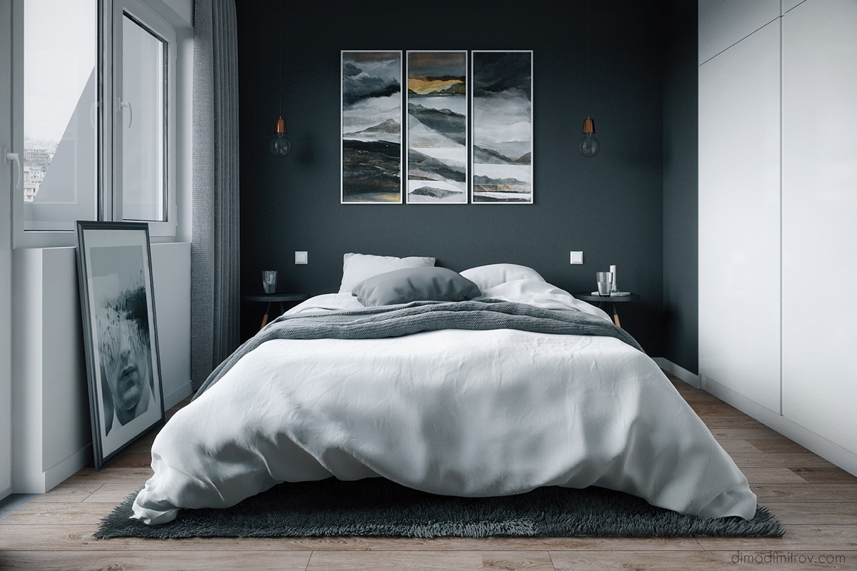 Phòng ngủ cũng được thiết kế tông màu xám chủ yếu. Đèn treo phòng ngủ treo lủng lẳng trên các phụ kiện bằng đồng sáng bóng làm điểm nhấn.