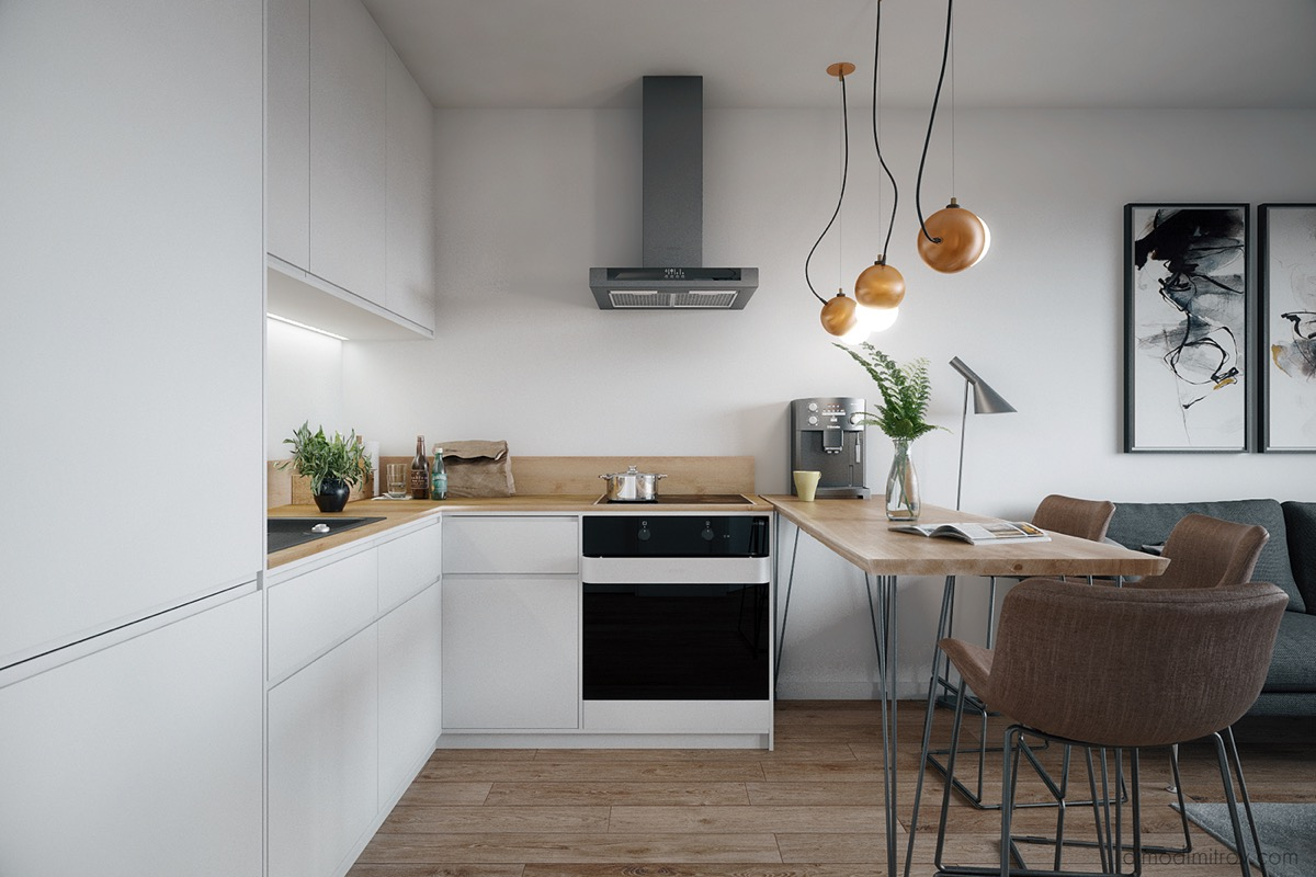 Tủ màu trắng tạo nên một thiết kế nhà bếp hình chữ L sạch sẽ, mặt bàn gỗ ấm áp.