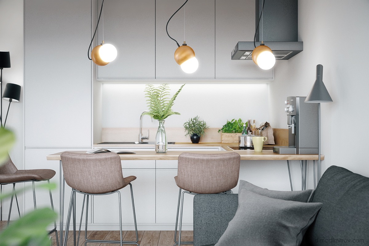 Nội thất nhà bếp khá đơn giản nhưng tiện nghi. Máy pha cà phê được đặt ở vị trí thuận tiện ở cuối quầy bar bên cạnh phòng khách.